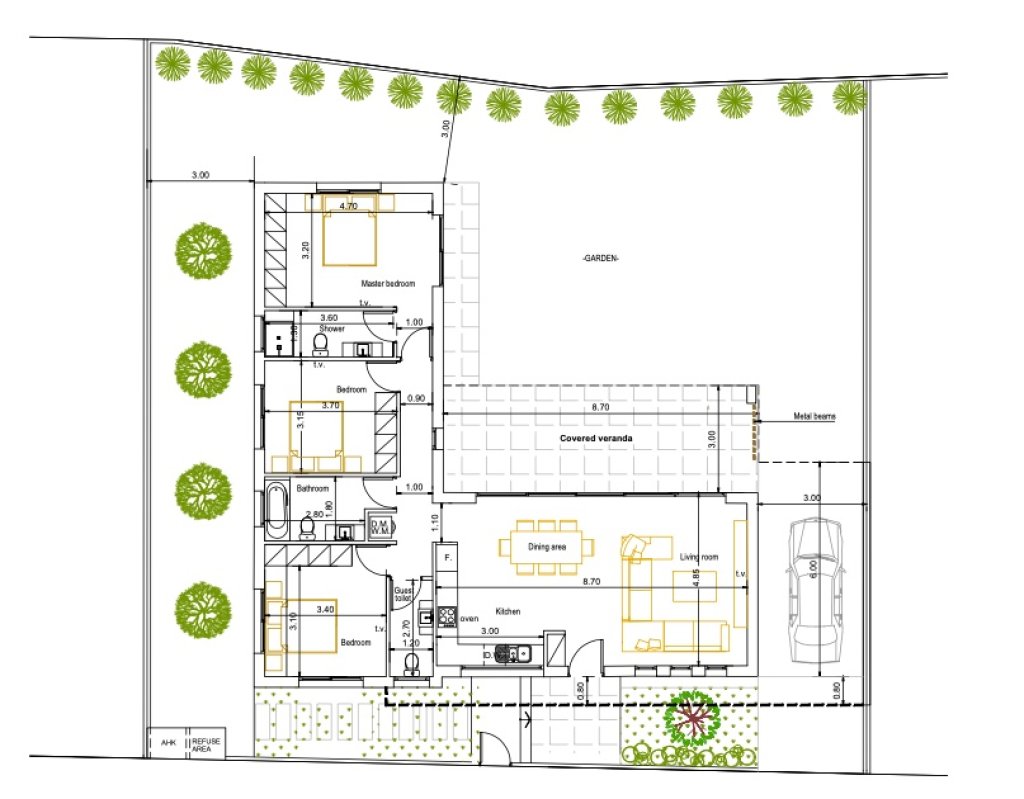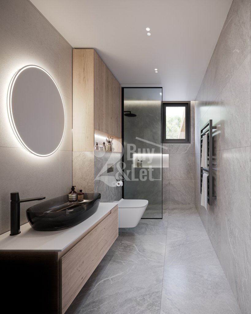 Built to Grade A energy efficiency standards, the home includes thermal insulation, double-glazed windows, photovoltaic solar panels, and a pressurized water system with a solar water tank.