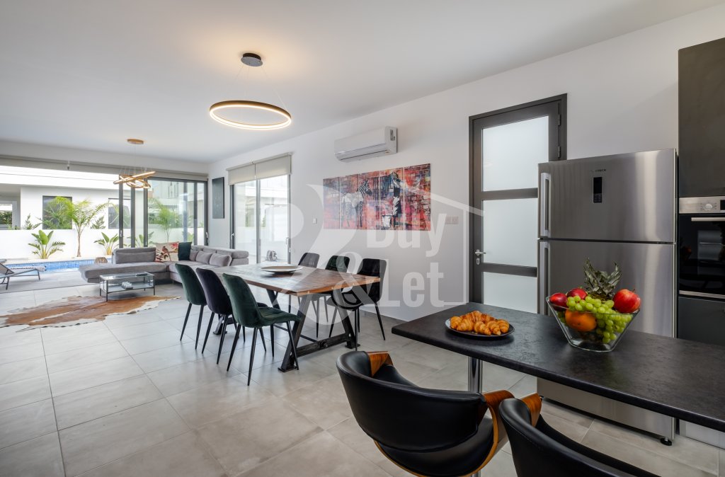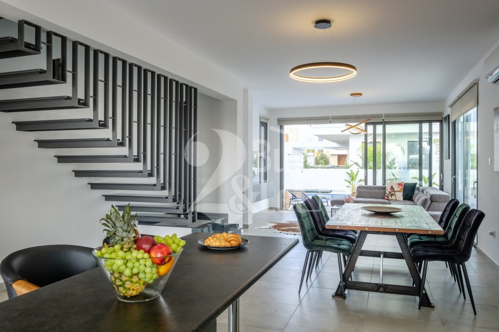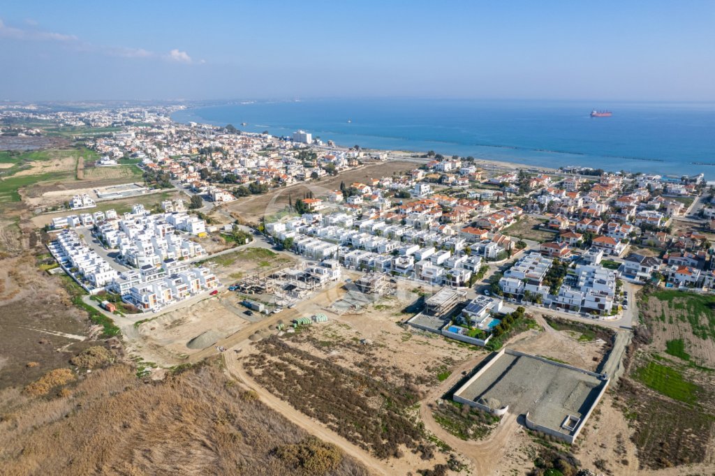 The villa is located in Livadia, Larnaca just a short walk from the beaches of the region's tourist area. It offers a luxurious and modern layout designed to provide a high standard of living in a serene and picturesque environment. The villa features contemporary Mediterranean architecture with clean lines, large windows, and spacious balconies. The property typically includes a private swimming pool, a sunbathing area, and a covered patio or pergola for outdoor dining and relaxation. Two covered parking spaces are also part of the package.